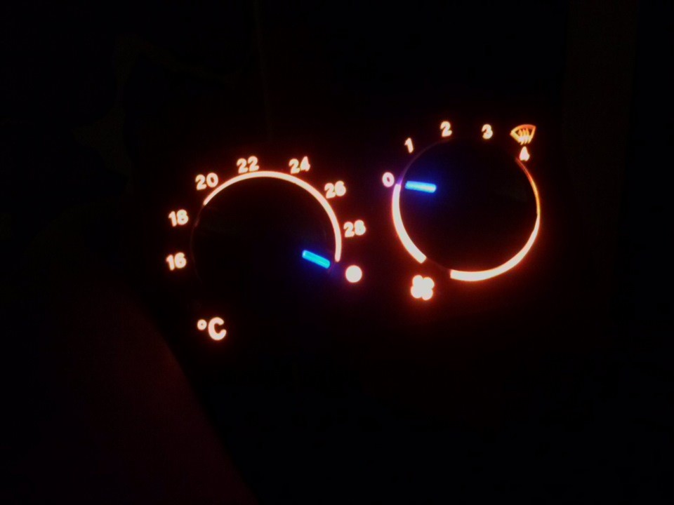Сегодня немного пофантазировал и сделал подсветку переключателей печки. Стиль выбирал красно-синий. Использовал светодиоды красного цвета 1206 и резисторы 470 Ом.