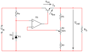 В качестве примера приведена схема на рисунке. Часть выходного напряжения Uout{\displaystyle U_{out}}, снимаемая с резистивного делителя напряжения, состоящего из потенциометра R2{\displaystyle R2} и постоянных резисторов R1, R3{\displaystyle R1,\ R3} сравнивается с опорным напряжением Uz{\displaystyle U_{z}} от параметрического стабилизатора — стабилитрона D1{\displaystyle D1}. Разность этих напряжений усиливается дифференциальным усилителем на операционном усилителе (ОУ) U1{\displaystyle U1}, выход которого изменяет базовый ток транзистора, включенного по схеме эмиттерного повторителя[3].