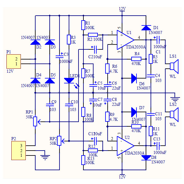 В случае если необходимо получить более мощное усиление звука, то можно собрать усилитель по мостовой схеме подключения TDA2030