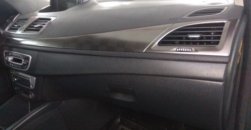 - Следующим шагом будет демонтаж декоративной накладки, верхней части панели Megane. Для этого нужно всего лишь потянуть её на себя с небольшим усилием и сдвинуть наружу. Отложите её в сторону.