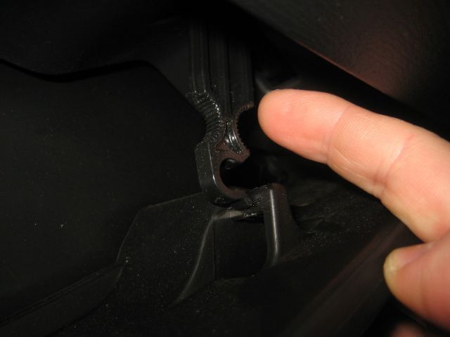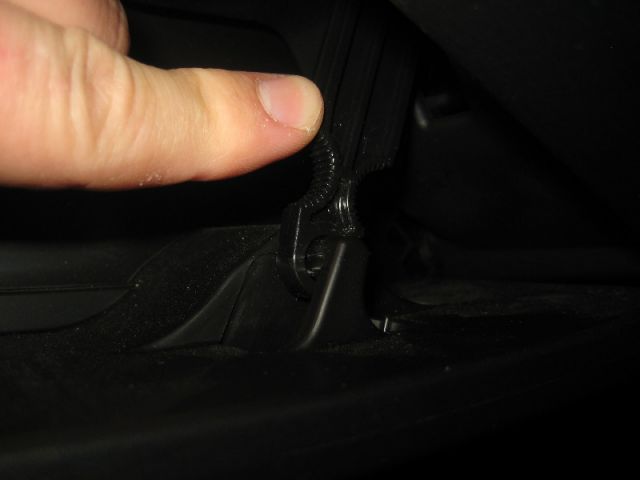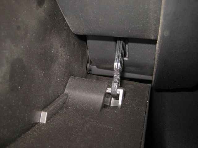 Затем нужно отсоединить удерживающий крепеж. Для этого нужно на внешней стороне правой стенки бардачка найти защелку со специальным ремешком. Чтобы снять эту защелку, нужно надавить на неё снизу.