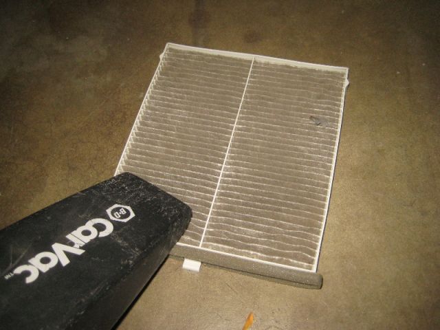 Далее надо потянуть за «язычок» старый салонный фильтр, извлекая его с корпуса. Осмотреть с двух сторон, чтобы принять решение — чистить или менять. Если фильтр забит листьями, веточками, насекомыми и волосами, а также покрыт грязью — его надо заменить. Припорошенный пылью фильтр можно продуть и установить обратно.